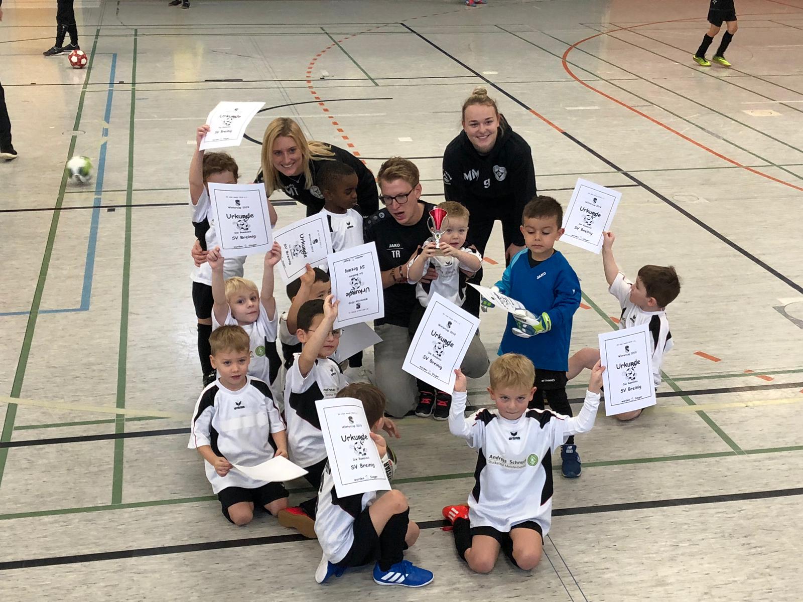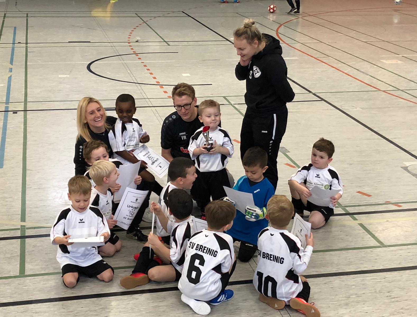 Am Samstag bestritten die Breiniger Minis der Jahrgänge 2014/2015 ihr allererstes Turnier im Goethe Gymnasium bei dem Ausrichter ASA Atsch. Nach einem 0:0 gegen die Gastgeber im ersten Spiel, gewannen die 3-4 jährigen gegen die älteren Kinder von Adler Büsbach mit 3:0. Dabei waren einige Tore richtig gut rausgespielt. Das komplette Trainerteam war dabei und konnte mit ansehen, wie die Kleinen das erste Mal richtig in Zweikämpfe gingen. Die Kinder waren unglaublich glücklich und freuten sich über ihre erste Urkunde sowie über ihren ersten Pokal und konnten über nichts anderes mehr reden. Insgesamt war das Blitzturnier ein voller Erfolg für die jungen Breiniger.